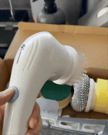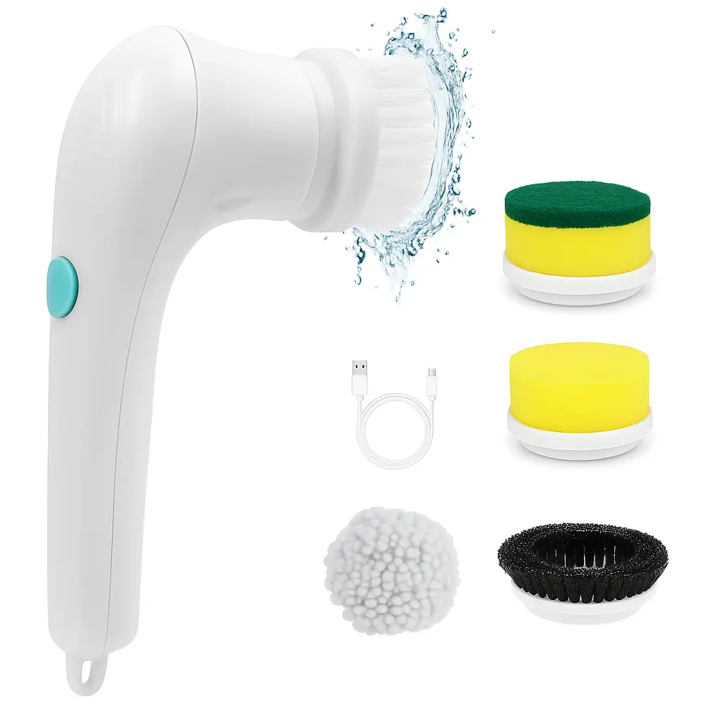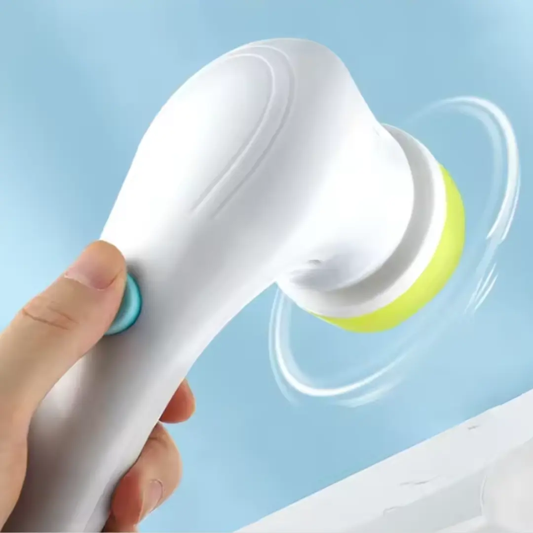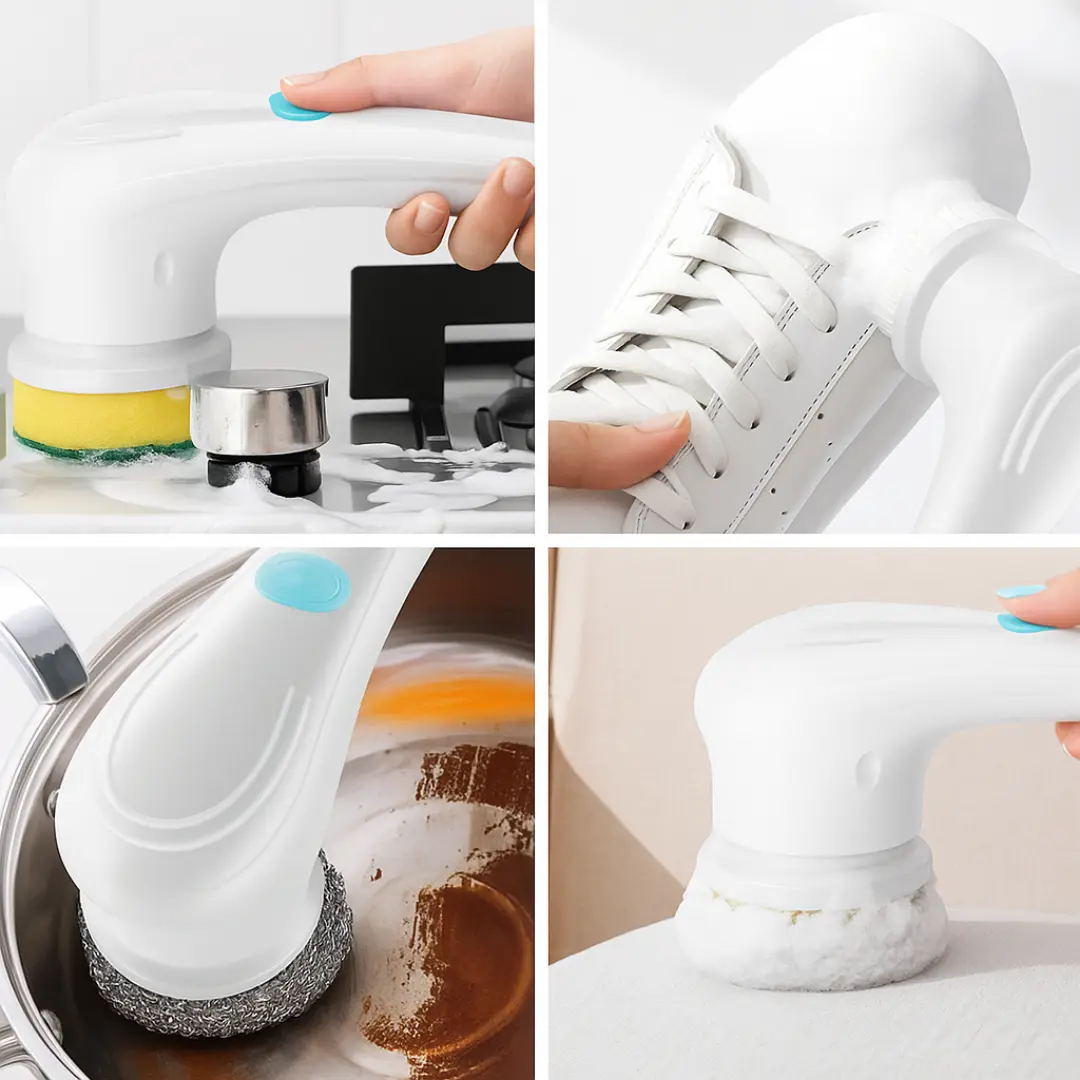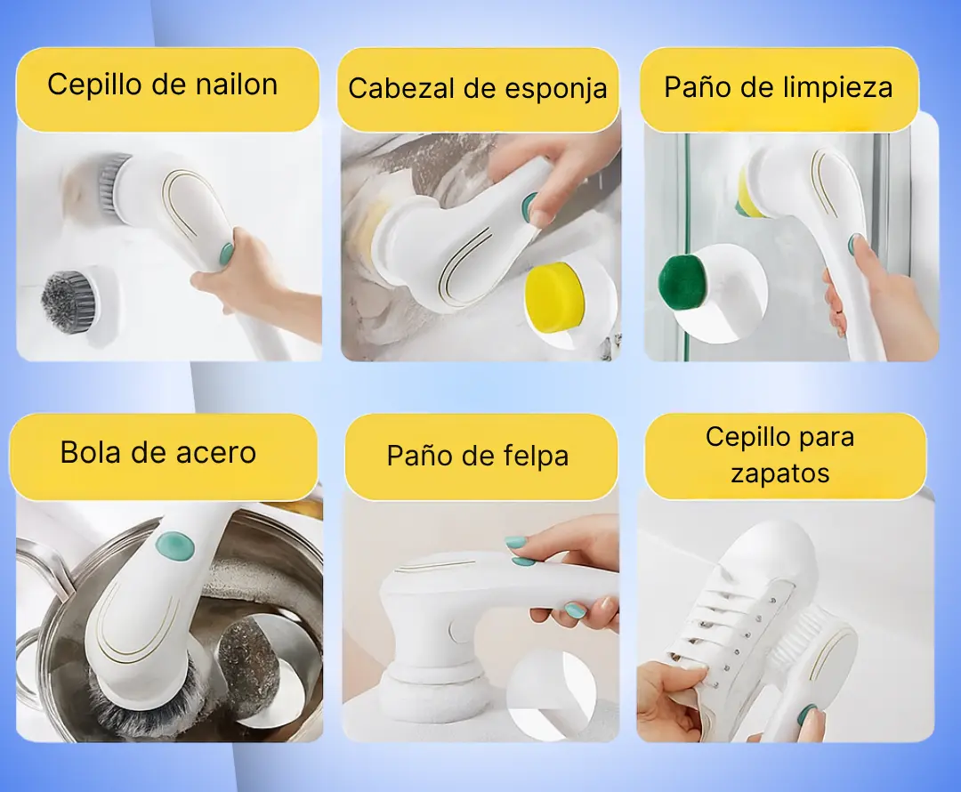 Con sus 5 cabezales intercambiables, el cepillo se adapta a cualquier superficie. Sus cinco cabezales giratorios hacen todo el trabajo por vos: esponja, lana de acero, pulidor, microfibra y fibra abrasiva.